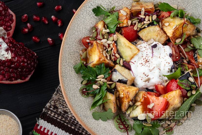 Кохання з першого шматочка: соковитий хрусткий баклажан, стиглі томати, мікс насіння, пряна зелень та йогуртова заправка.