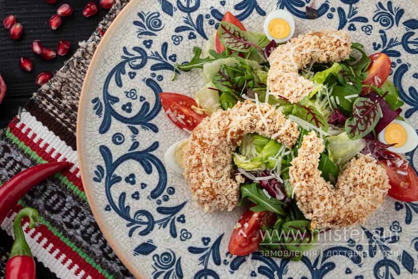 Салат з королівськими креветками, запанірованими в панко, та солодко-гірчичною заправкою.
