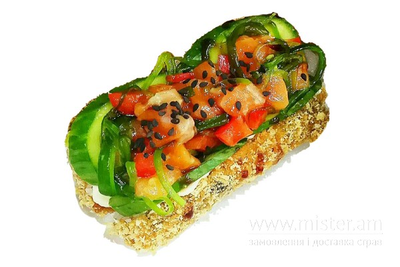 Лосось, сир Філадельфія, водорості хіяші, перець болгарський, соус Унагі, паніровка.