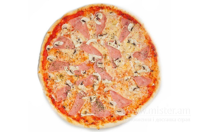 Соус червоний, сир Моцарела, шинка, салямі, гриби, помідор, маслини, зелень.