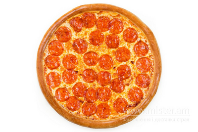 Соус червоний, сир Моцарела, салямі, паприка, червоний перець.