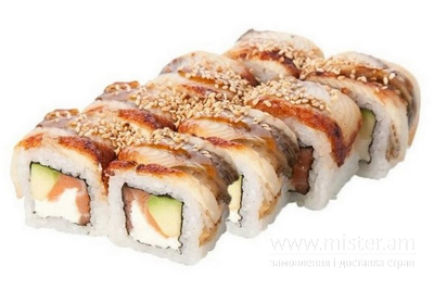Вугор, лосось, огірок, сир Філадельфія, соус Унагі, кунжут смажений.