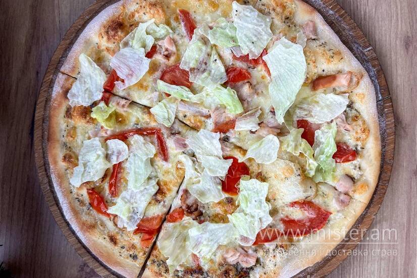 Вершковий соус, соус Цезар, моцарела, куряче філе копчене, бекон, помідор, айсберг, пармезан.