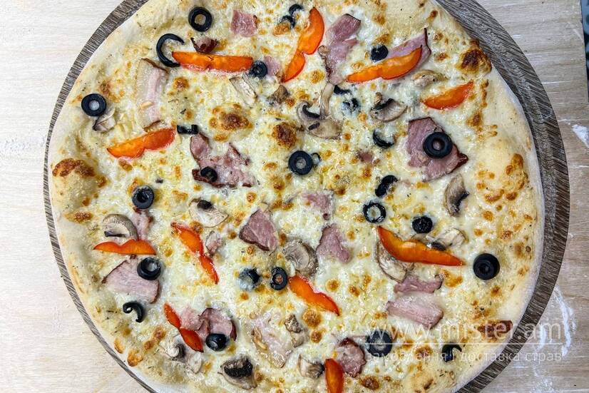 Вершковий соус, часниковий соус, моцарела, бекон, печериці гриби, маслини, болгарський перець, часник.