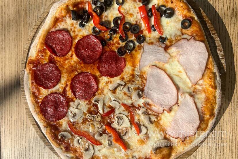 Томатний соус, моцарела, балик, салямі баликова, болгарський перець, печериці гриби, маслини.
