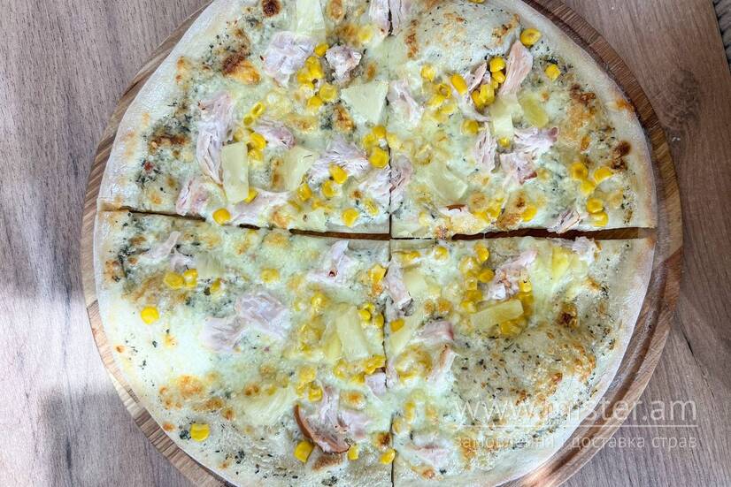 Вершковий соус, моцарела, куряче філе копчене, ананас, кукурудза, рукола.