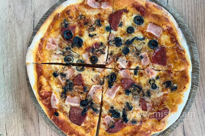 Томатний соус, моцарела, балик, салямі, бекон, печериці гриби, маслини.