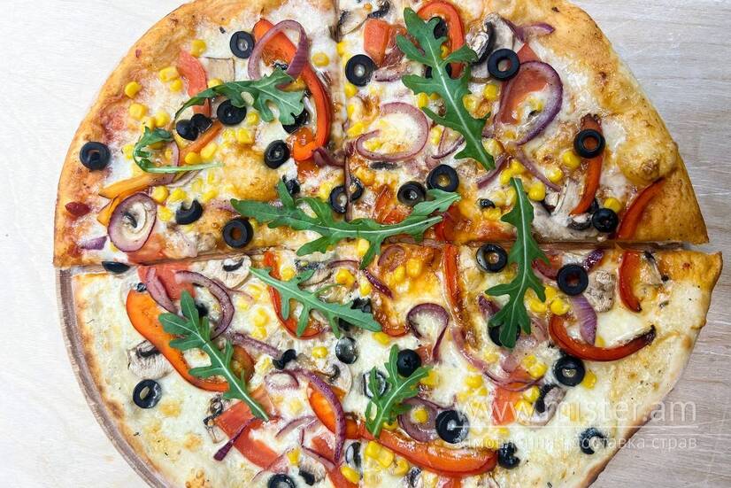 Вершковий соус, моцарела, маслини, болгарський перець, маринована цибуля, кукурудза, печериці гриби, рукола.