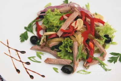 Відварна телятина, мариновані грибочки, солоний огірок та болгарський перець - все це приправлено олійкою з часничком, та прикрашено маслинами