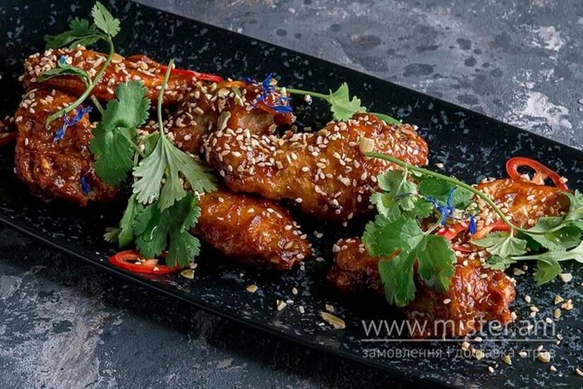 Це смачна закуска зі соковитими крильцями, обсмаженими до золотистого кольору, що супроводжується смаковитим, ароматним соусом, який надає цьому страві особливого смаку та хрусткості.