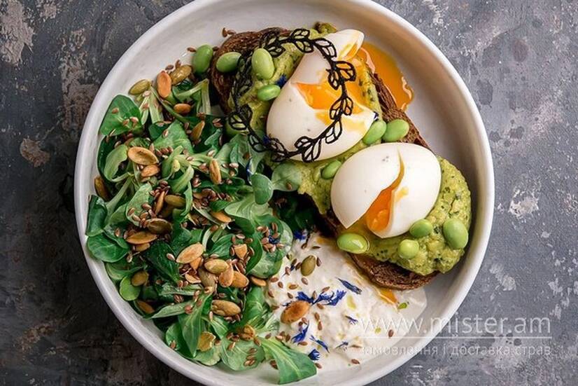 Авокадо тост з креветкою, яйцем пашот, томатами чері та соусом Голландез
