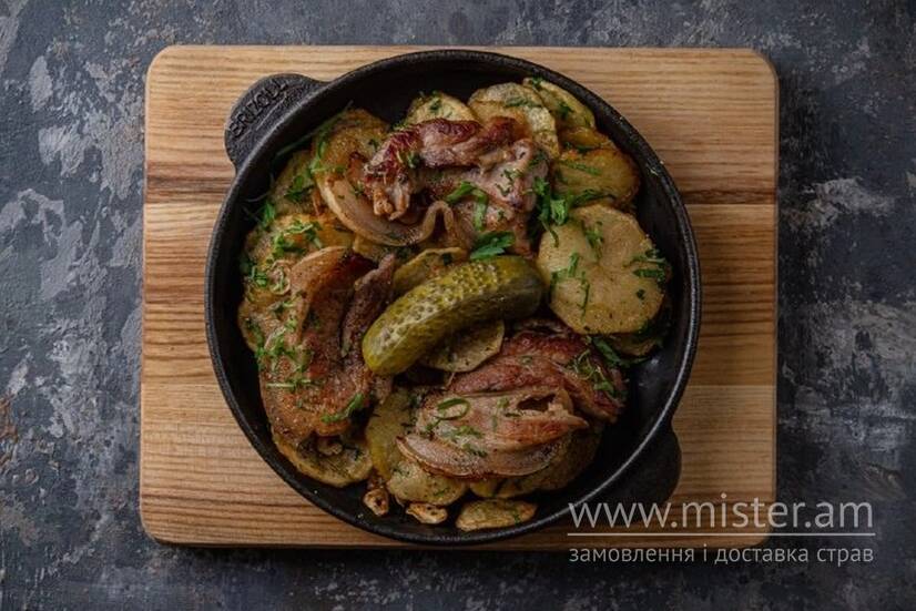 Картопля смажена з підчеревиною та кислим огірком. Подається з квашеним огірком та зеленню.