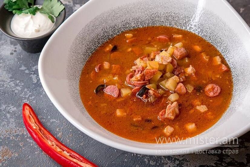 Фірмова солянка з чотирьох видів м`яса зі сметаною