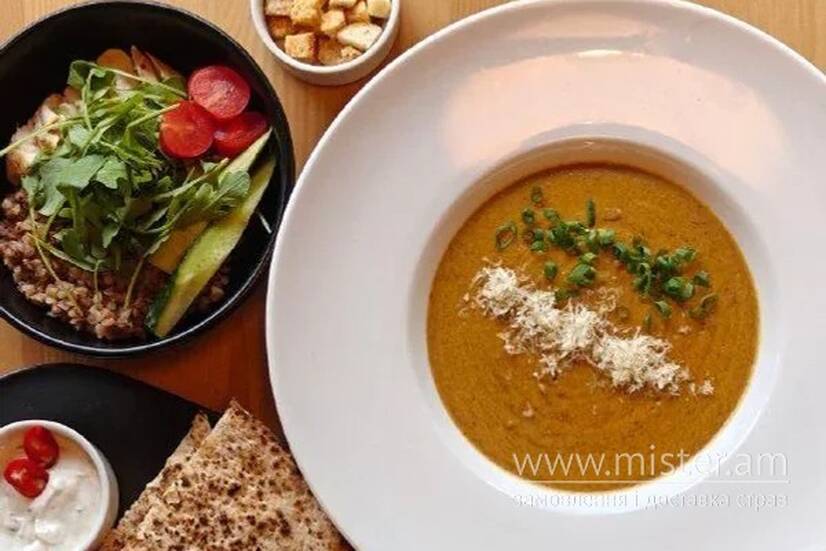 Суп з курячими фрикадельками; салат Цезар з куркою, томатами чері, пармезаном та сицилійськими сухарями; паста орзо зі шпинатом та смаженими тигровими креветками; компот, еклер, хліб.
