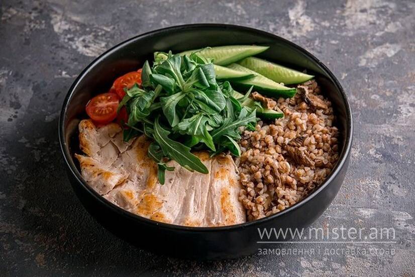 Гречка з куркою сувід, білими грибами та свіжими овочами