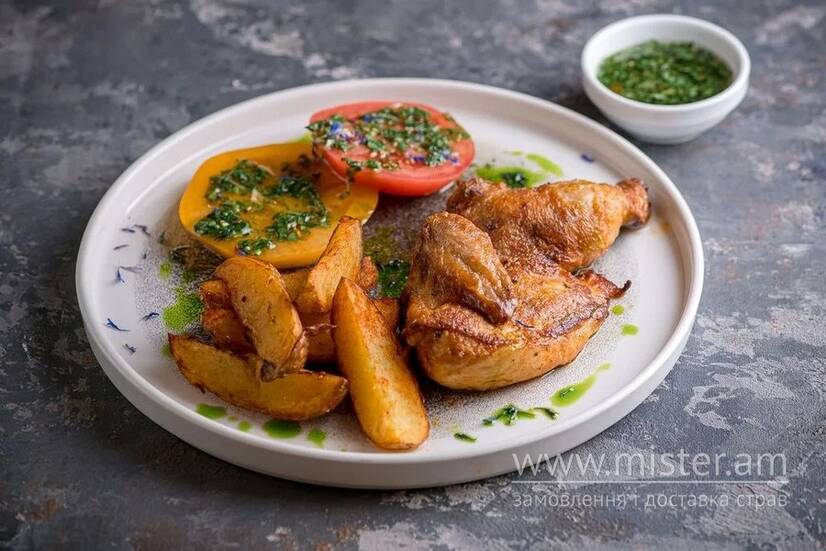Половинка курча з соусом чімічурі та смаженою картоплею