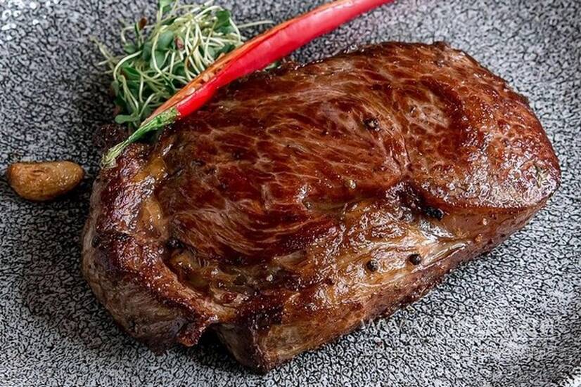 Це шматок яловичини, зазвичай відпилений зі стегна або реберного відділу туші, який має характерний мармуркований жир та велику кількість м`яса біля кістки, що надає стейку особливий смак і ніжність.
