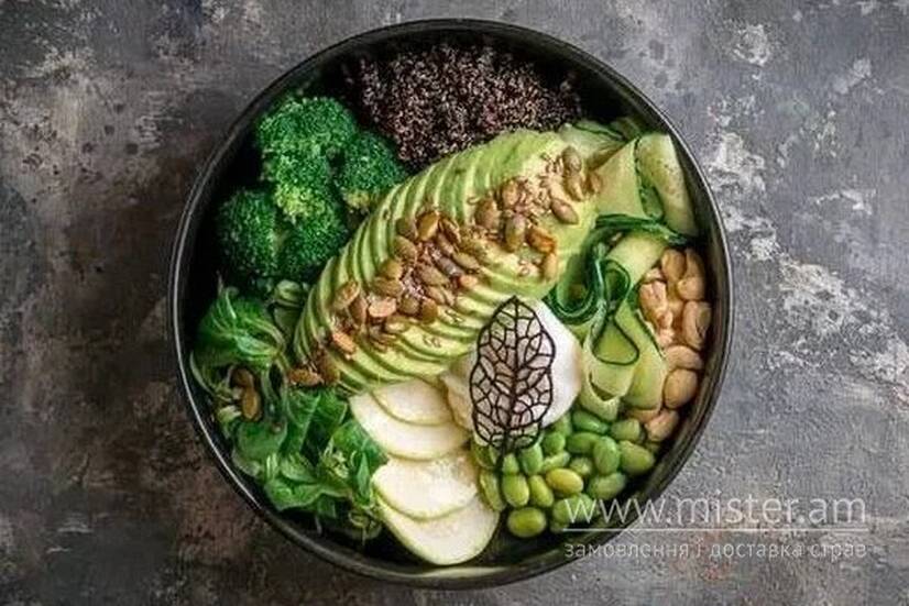 Авокадо, брокколі, кіноа чорне, огірки свіжі, боби едамаме, рукола, кабачки, яйце пашот, мікс насіння, кеш`ю.