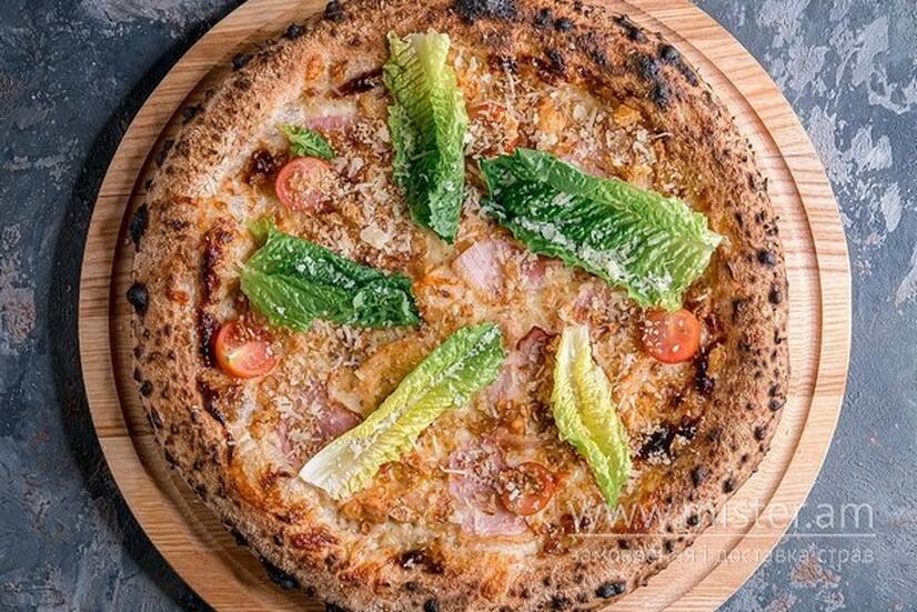 Це варіація на класичну салат Цезар, але у вигляді піци. На тісті розташовані шматочки курячого м`яса, пармезан, томати черрі та хрумка цибуля. Ця піца вражає смакові рецептори яскравими смаками курячого м'яса, сирною пікантністю пармезану, свіжістю томатів та ароматом хрумкої цибулі, створюючи багатогранний смаковий досвід.