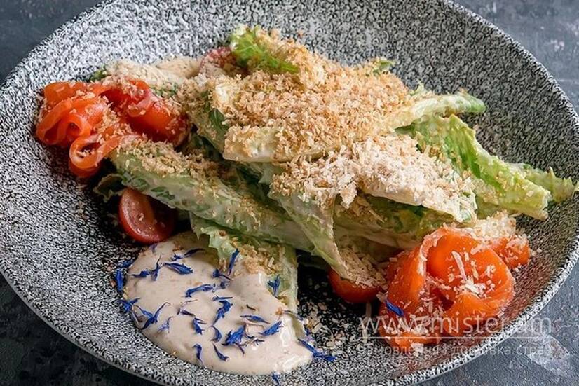 Салат Цезар зі слабосоленим лососем, томатами чері, пармезаном та сицілійськими сухарями - це елегантна комбінація ніжного лосося, свіжих томатів чері та сицилійських сухарів, доповнена ніжним пармезаном, що додає страві вишуканості та неповторного смаку.