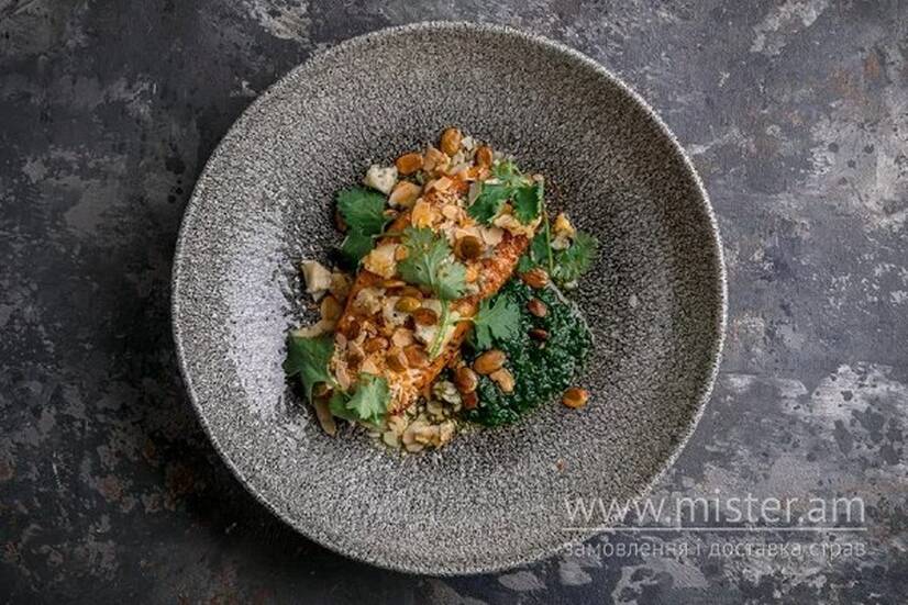 Батат запечений з горгонзолою, часниковим соусом та горіхами