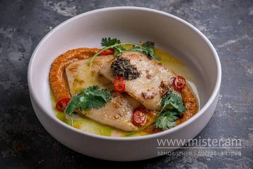 Кальмар з соусом Ромеско топенадом з маслин