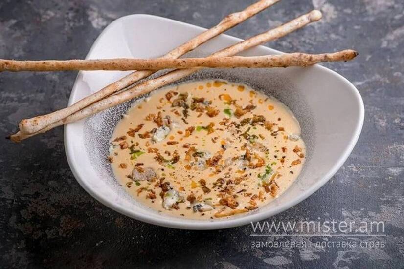 The Truffle Сирний крем-суп з Дор-блю, грісіні та хрусткою цибулею