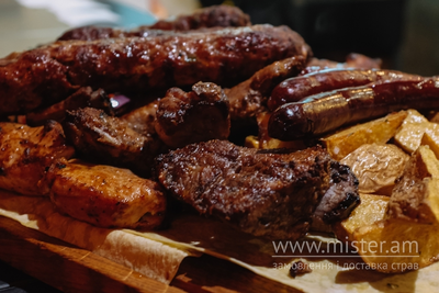 Шашлик зі свинини, телятини та курки, люля-кебаб зі свинини, телятини та баранини, реберця, мисливські ковбаски, запечена картопля та овочі, три види соусів.