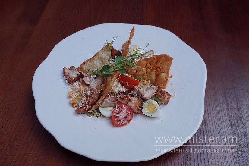 Шашличок з курки, перепелині яйця, сухарики з лавашу, томати чері, мікрогрін, пармезан та соус цезар.
