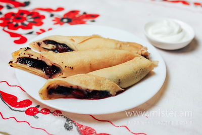 Тісто готується з пшеничного борошна на молоці з додаванням яєць, солі, цукру, олії, смаженого на гарячій пательні з обох сторін. Макова начинка з вишнями та вершками.