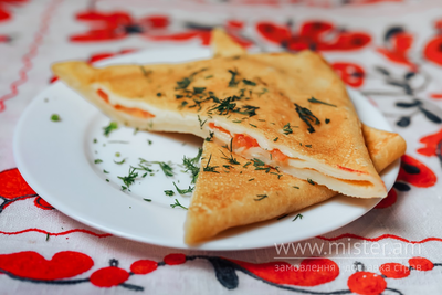 Тісто готується з пшеничного борошна на молоці з додаванням яєць, солі, цукру, олії, смаженого на гарячій пательні з обох сторін. Начинка: шинка, сир та помідори.