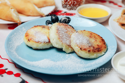 Сирники готуються з домашнього сиру, родзинок, цукру, борошна та яєць. Подаються с заправкою на вибір: сметана, конфітюр, вершки, мед. Ідеально підходять до сніданку або на десерт.