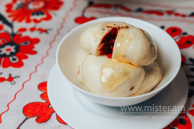 Ягоди по сезону. Фарш: ягоди з цукром.Тісто на пару. Заправка на вибір: сметана, солодкий соус, мед.