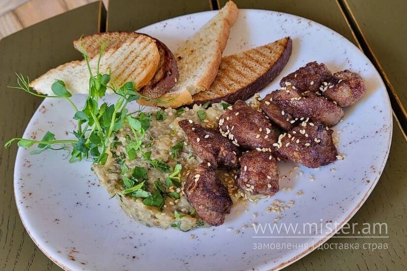Обсмажена в коньяці, подається з пряною ікрою із запеченого баклажану.