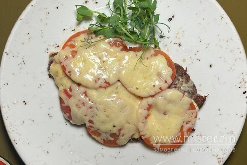 Ніжна відбивна з телятини з ароматними томатами під сирною скоринкою.