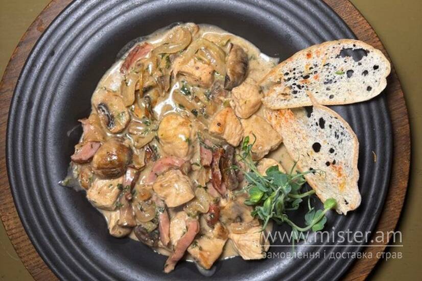 Шматочки курячого філе з беконом і печерицями, тушковані в шпинатно-вершковому соусі - дуже смачно, ароматно і ситно!