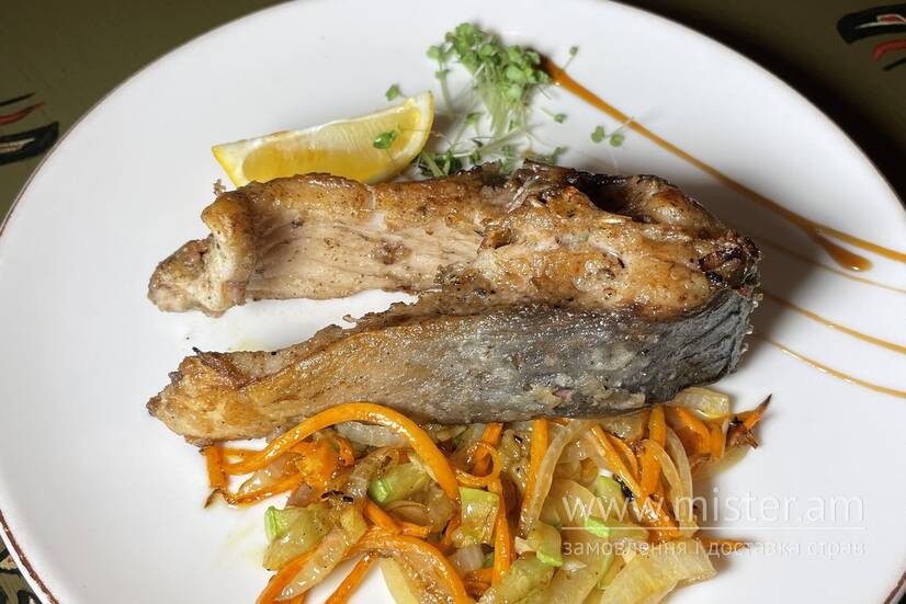 Золотиста скоринка, ніжне м`ясо та насичений смак - це стейк із коропа. Подається на подушці з пряними овочами.