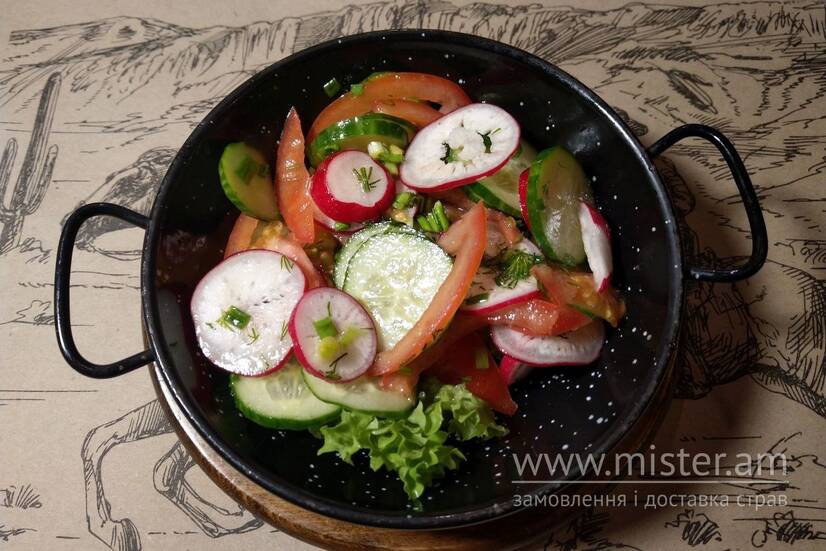 Салат з редискою, огірком, томатами та ранньою зеленню