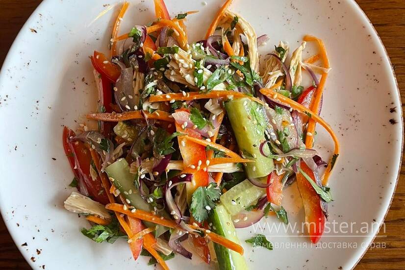 Пряний салат з маринованою спаржею, солодким перцем, морквою, огірком і червоною цибулею