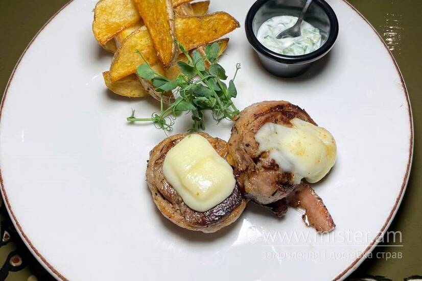 М`ясні медальйони дуже ніжні та соковиті, загорнуті в смужки з бекону, чудово поєднуються з картоплею по-селянськи. Подаються з часниковим соусом.