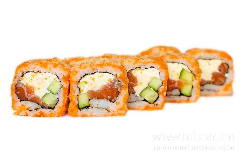 Рис, норі, лосось, крем-сир, огірок, ікра, сухарі панко.