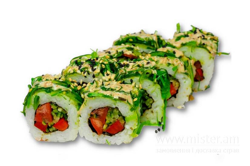 Рис, норі, хіяші, помідор, перець болгарський, огірок, соус горіховий, кунжут, імбир, васабі, соєвий соус.