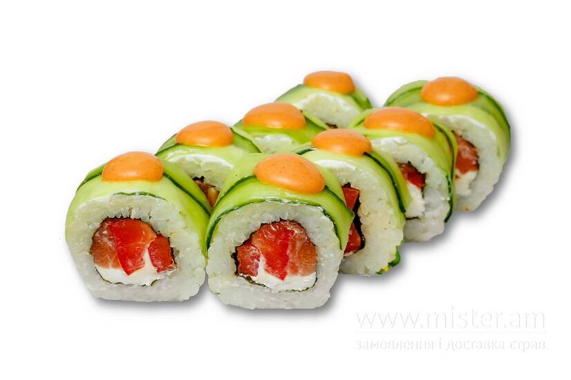 Рис, норі, крем-сир, лосось, перець болгарський, огірок, соус спайсі, імбир, васабі, соєвий соус.