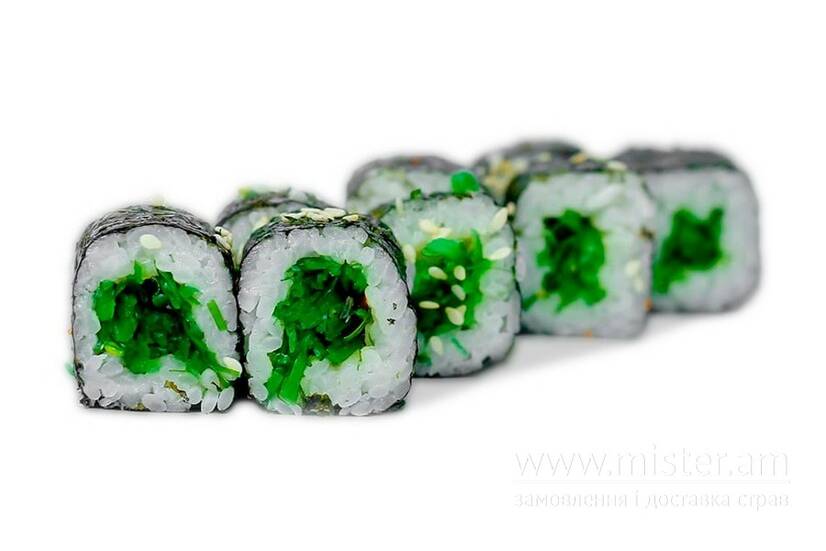 Рис, норі, хіяші, соус горіховий, кунжут білий, імбир, васабі, соєвий соус.