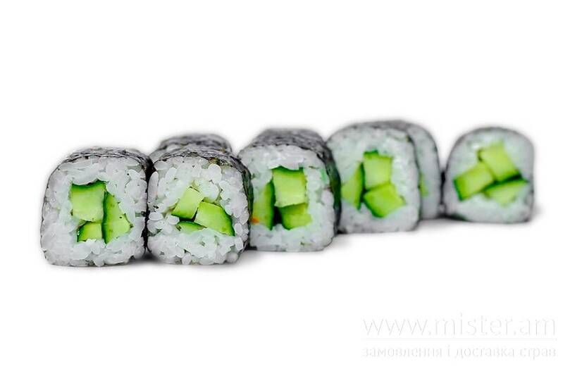 Рис, норі, огірок, імбир, васабі, соєвий соус.