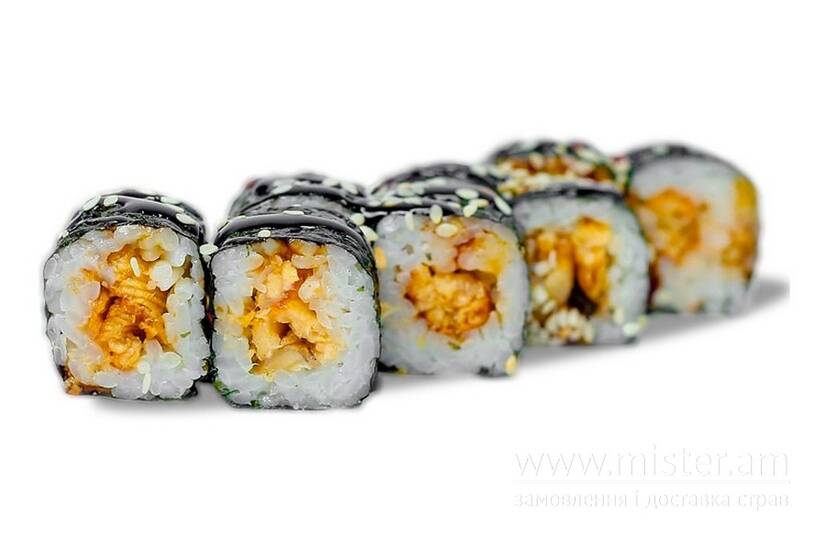 Рис, норі, вугор, соус унагі, кунжут білий, імбир, васабі, соєвий соус.
