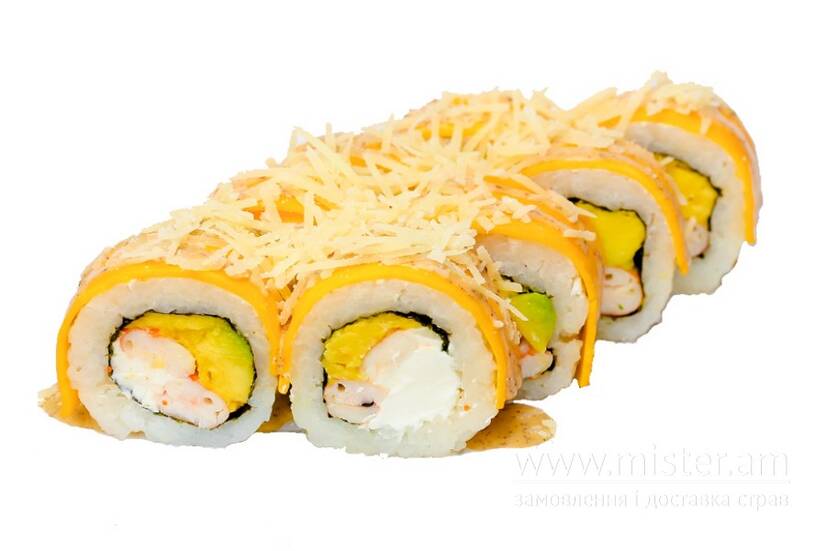 Рис, норі, крем-сир, креветка, авокадо, сир чеддер, соус горіховий, сир пармезан, імбир, васабі, соєвий соус.