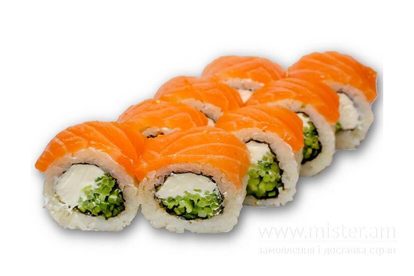 Рис, норі, лосось, крем-сир, огірок, імбир, васабі, соєвий соус.