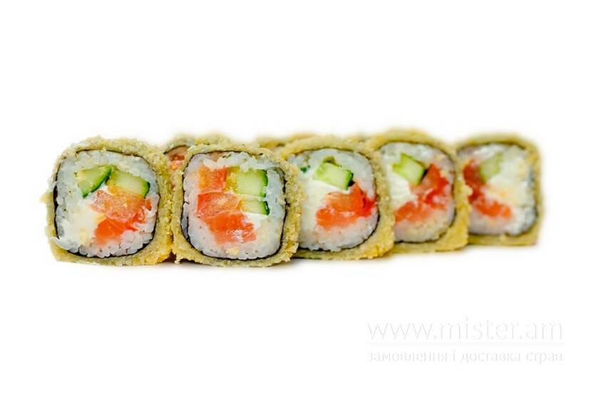 Рис, норі, крем-сир, лосось, огірок, помідор, кляр темпура, соус унагі, кунжут чорний, імбир, васабі, соєвий соус.