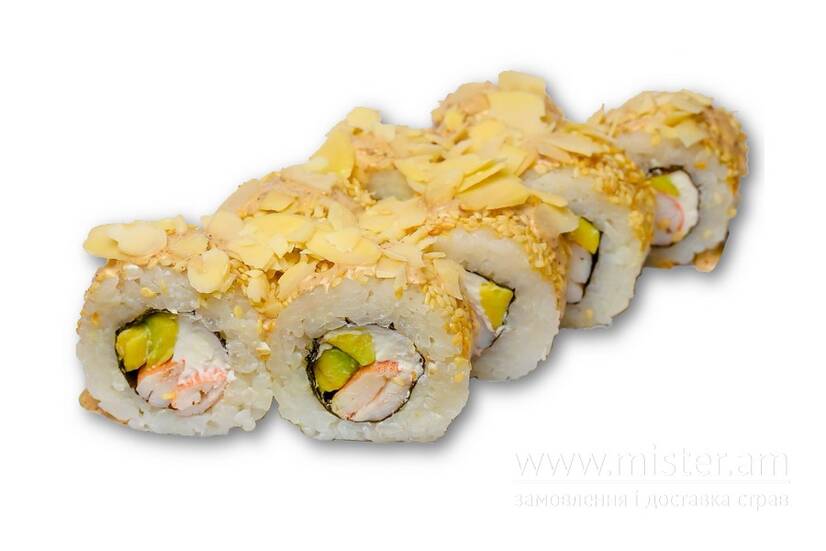 Рис, норі, крем-сир, креветка, авокадо, соус горіховий, мигдальні пластівці, кунжут білий, імбир, васабі, соєвий соус.